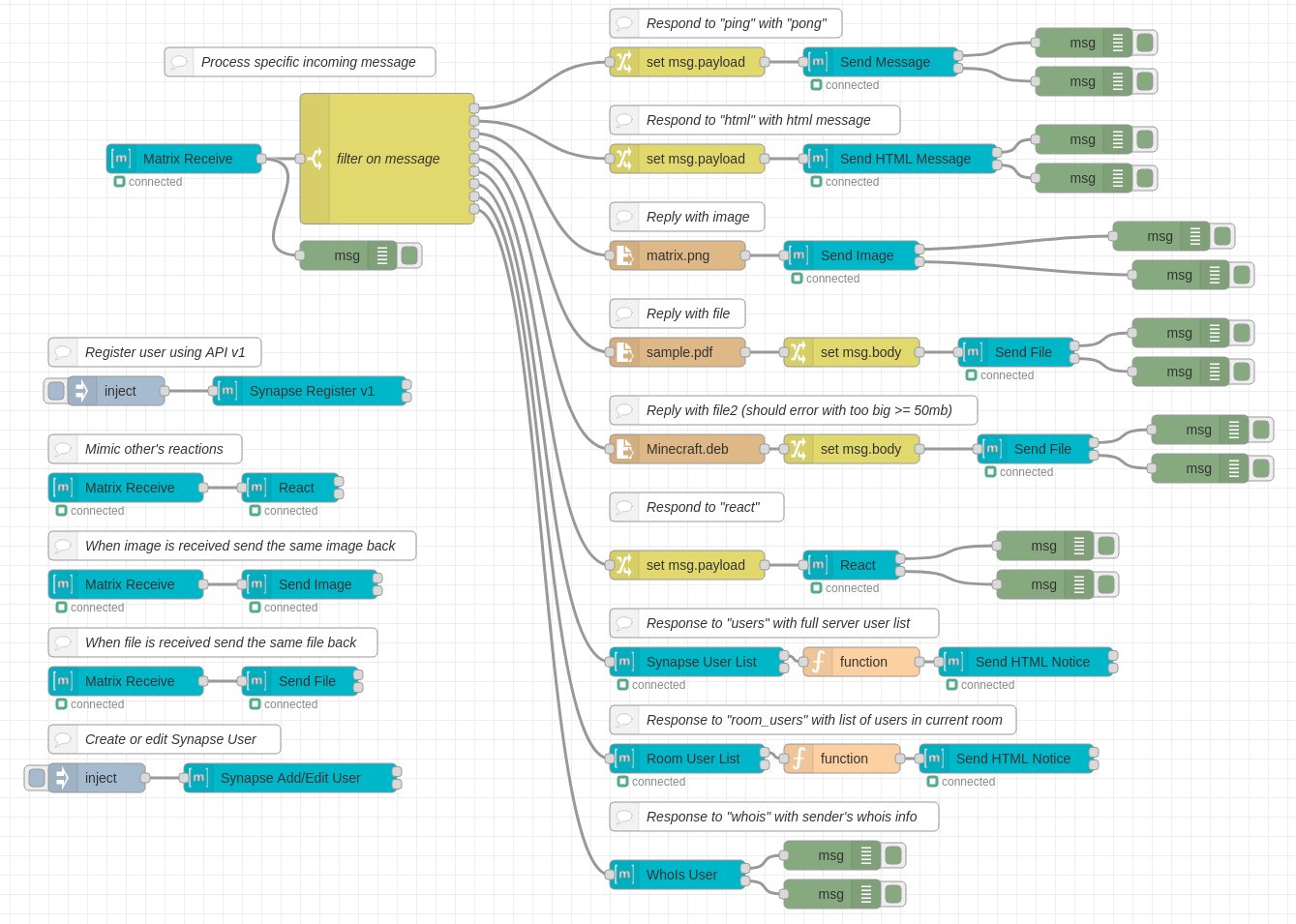 - change all references from msg.roomId to msg.topic to conform to Node-RED standards. - Added node for listing Synapse users server-wide (as long as the caller is an admin) - Events for Room.timeline are now handled by the server-config node and node's that listen for it bind a listener to that instead of the matrix client. - Added kick and ban nodes for kicking/banning from a room - Added node for fetching synapse user list using synapse admin API - Added node for fetching whois data from a user using Matrix admin API - Added node for deactivating users using the Synapse admin API - Can register users using the Synapse admin endpoint v1 (yay legacy) - Can add users using the Synapse admin endpoint v2 - Add more info to the readme.